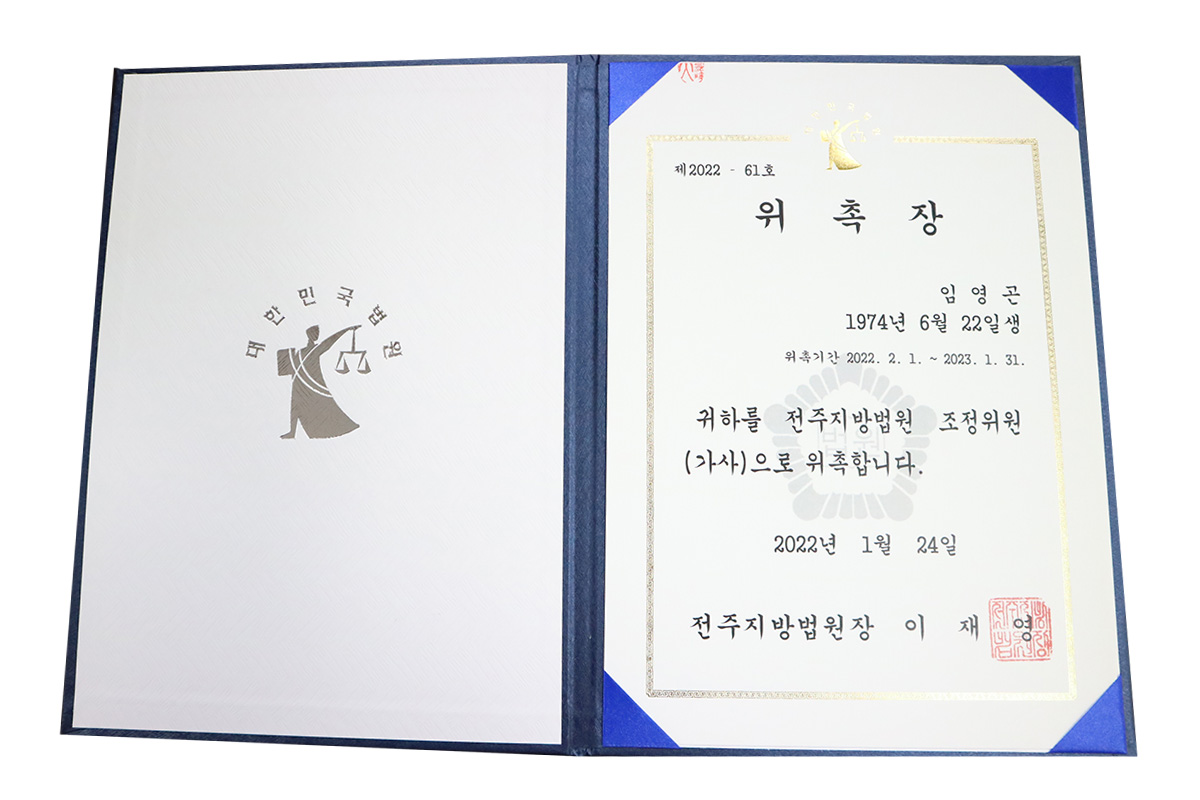 임영곤 대표변호사님께서 전주지방법원 조정위원 위촉되셨습니다.